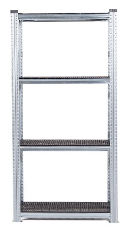 Lagerhylla Flex, grund, BxDxH 976x500x1972, 4 st svarta hyllplan. Ett flexibelt hyllsystem av galvaniserat stål med många användningsområden. Låg egenvikt med klarar hög belastning, 135-350 kg/hyllplan. Flyttbara balkar, 33 mm:s intervall. Olika typer av hyllplan för olika arbetsmiljöer. Enkel att montera (inga bultar eller skruvar). Kan användas från båda håll, inga krysstag behövs. Gavlar levereras monterade, bärbalkar och metallfötter ingår i varje sektion. Samtliga plasthyllplan är perforerade för att fungera i miljöer med sprinklersystem då vattnet rinner igenom hyllplanen. Alla plasthyllplan är även godkända för livsmedelsmiljö.