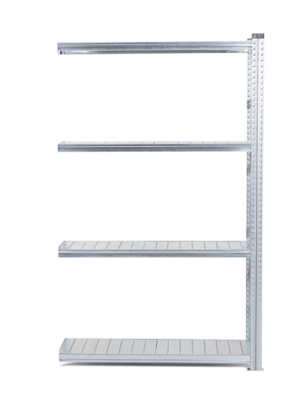 Lagerhylla Flex, utbyggnad, BxDxH 1206x600x1972, 4 st galvade hyllplan. Ett flexibelt hyllsystem av galvaniserat stål med många användningsområden. Låg egenvikt men klarar hög belastning, 135-350 kg/hyllplan.