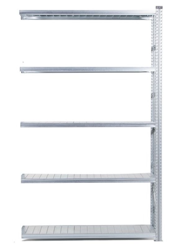 Lagerhylla Flex, utbyggnad, BxDxH 1506x320x2500, 5 st galvade hyllplan. Ett flexibelt hyllsystem av galvaniserat stål med många användningsområden. Låg egenvikt men klarar hög belastning, 135-350 kg/hyllplan.