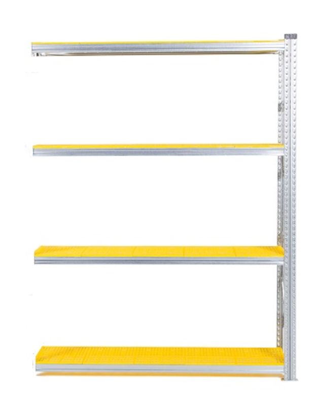 Lagerhylla Flex, utbyggnad, BxDxH 1506x600x1972, 4 st gula hyllplan. Ett flexibelt hyllsystem av galvaniserat stål med många användningsområden. Låg egenvikt med klarar hög belastning, 135-350 kg/hyllplan. Flyttbara balkar, 33 mm:s intervall. Olika typer av hyllplan för olika arbetsmiljöer. Enkel att montera (inga bultar eller skruvar). Kan användas från båda håll, inga krysstag behövs. Gavlar levereras monterade, bärbalkar och metallfötter ingår i varje sektion. Samtliga plasthyllplan är perforerade för att fungera i miljöer med sprinklersystem då vattnet rinner igenom hyllplanen. Alla plasthyllplan är även godkända för livsmedelsmiljö.