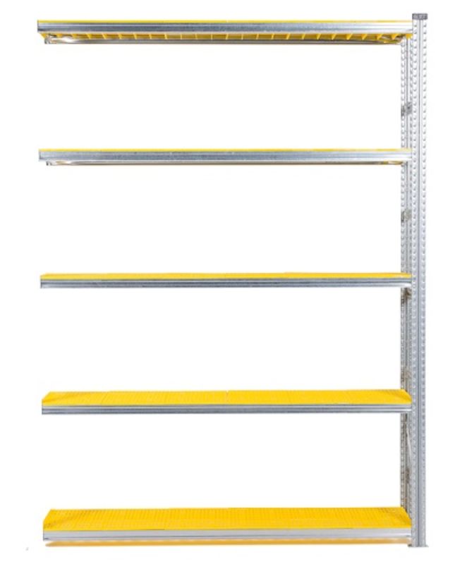 Lagerhylla Flex, utbyggnad, BxDxH 1806x400x2500, 5 st gula hyllplan. Ett flexibelt hyllsystem av galvaniserat stål med många användningsområden. Låg egenvikt med klarar hög belastning, 135-350 kg/hyllplan. Flyttbara balkar, 33 mm:s intervall. Olika typer av hyllplan för olika arbetsmiljöer. Enkel att montera (inga bultar eller skruvar). Kan användas från båda håll, inga krysstag behövs. Gavlar levereras monterade, bärbalkar och metallfötter ingår i varje sektion. Samtliga plasthyllplan är perforerade för att fungera i miljöer med sprinklersystem då vattnet rinner igenom hyllplanen. Alla plasthyllplan är även godkända för livsmedelsmiljö.