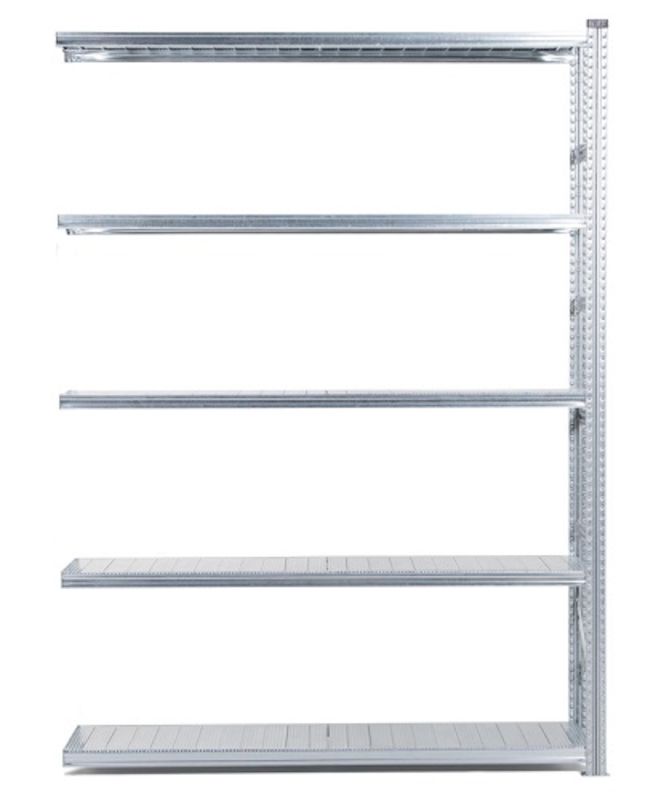 Lagerhylla Flex, utbyggnad, BxDxH 1806x800x2500, 5 st galvade hyllplan. Ett flexibelt hyllsystem av galvaniserat stål med många användningsområden. Låg egenvikt men klarar hög belastning, 135-350 kg/hyllplan.