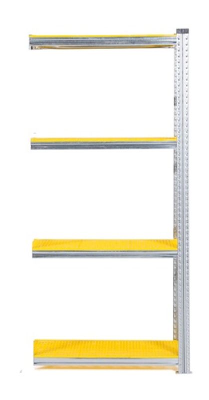 Lagerhylla Flex, utbyggnad, BxDxH 906x500x1972, 4 st gula hyllplan. Ett flexibelt hyllsystem av galvaniserat stål med många användningsområden. Låg egenvikt med klarar hög belastning, 135-350 kg/hyllplan. Flyttbara balkar, 33 mm:s intervall. Olika typer av hyllplan för olika arbetsmiljöer. Enkel att montera (inga bultar eller skruvar). Kan användas från båda håll, inga krysstag behövs. Gavlar levereras monterade, bärbalkar och metallfötter ingår i varje sektion. Samtliga plasthyllplan är perforerade för att fungera i miljöer med sprinklersystem då vattnet rinner igenom hyllplanen. Alla plasthyllplan är även godkända för livsmedelsmiljö.