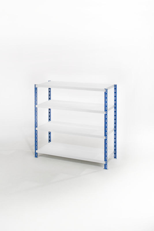 Lagerhylla Juhani, D 600 mm, med hyllplan av stålplåt, grundsektion, HxB 1508 x 1550 mm. Skruvar och pluggar för fotplattorna ingår ej.