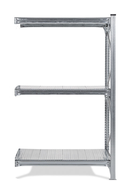 Lagerhylla Maxi, utbyggnad, BxDxH 1220x600x2000, galvade hyllplan. Lagerhylla Maxi är ett flexibelt hyllsystem av galvaniserat stål anpassat för skrymmande och volymkrävande gods. Låg egenvikt men klarar hög belastning, 450-500 kg/hyllplan. Maxi finns i fyra olika djup, från 600 till 1200 mm. Flyttbara balkar med 33 mm:s intervaller. Hyllplan i galvaniserad plåt. Enkel att montera (inga bultar eller skruvar). Kan användas från båda håll, inga krysstag behövs. Gavlar levereras monterade, bärbalkar och metallfötter ingår i varje sektion. Höjd 2000 elller 2500 mm.
