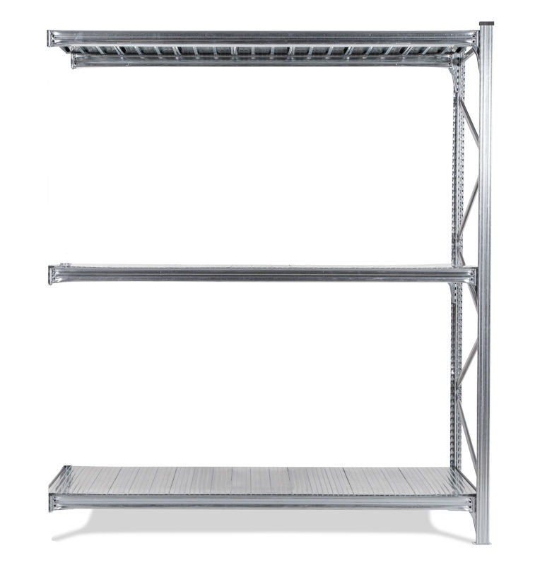 Lagerhylla Maxi, utbyggnad, BxDxH 2120x1000x2500, galvade hyllplan. Lagerhylla Maxi är ett flexibelt hyllsystem av galvaniserat stål anpassat för skrymmande och volymkrävande gods. Låg egenvikt men klarar hög belastning, 450-500 kg/hyllplan. Maxi finns i fyra olika djup, från 600 till 1200 mm. Flyttbara balkar med 33 mm:s intervaller. Hyllplan i galvaniserad plåt. Enkel att montera (inga bultar eller skruvar). Kan användas från båda håll, inga krysstag behövs. Gavlar levereras monterade, bärbalkar och metallfötter ingår i varje sektion. Höjd 2000 elller 2500 mm.