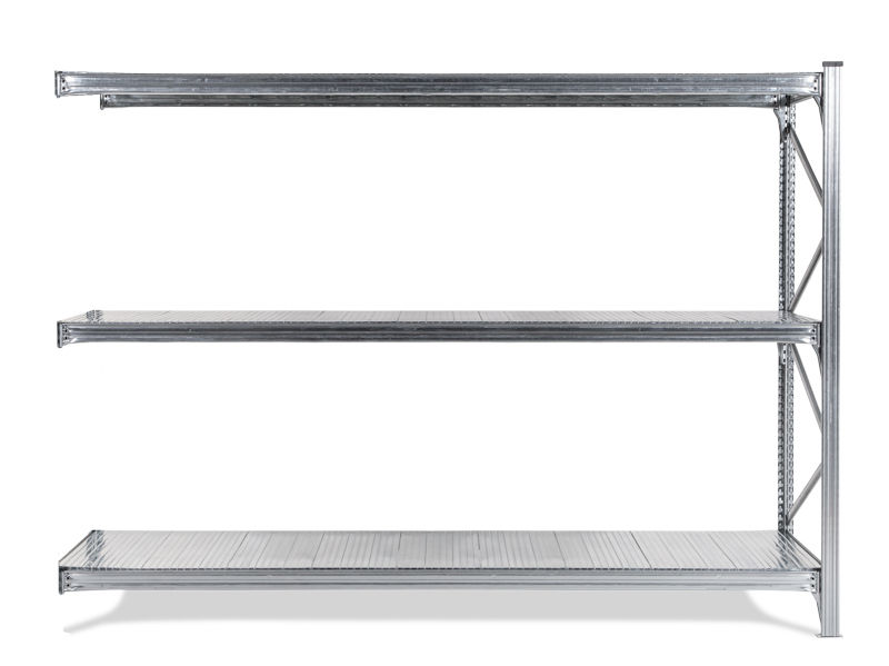 Lagerhylla Maxi, utbyggnad, BxDxH 2720x1200x2000, galvade hyllplan. Lagerhylla Maxi är ett flexibelt hyllsystem av galvaniserat stål anpassat för skrymmande och volymkrävande gods. Låg egenvikt men klarar hög belastning, 450-500 kg/hyllplan. Maxi finns i fyra olika djup, från 600 till 1200 mm. Flyttbara balkar med 33 mm:s intervaller. Hyllplan i galvaniserad plåt. Enkel att montera (inga bultar eller skruvar). Kan användas från båda håll, inga krysstag behövs. Gavlar levereras monterade, bärbalkar och metallfötter ingår i varje sektion. Höjd 2000 elller 2500 mm.