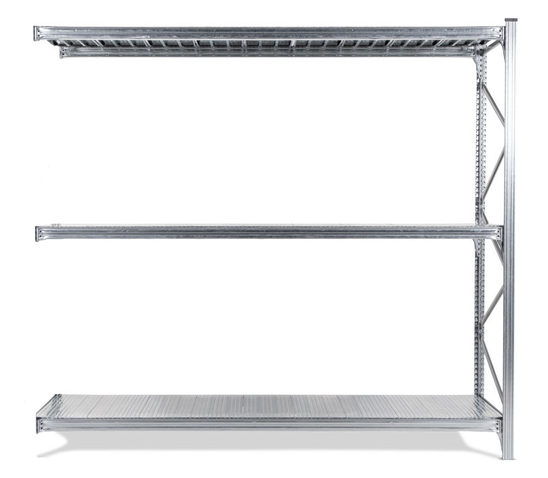 Lagerhylla Maxi, utbyggnad, BxDxH 2720x1200x2500, galvade hyllplan. Lagerhylla Maxi är ett flexibelt hyllsystem av galvaniserat stål anpassat för skrymmande och volymkrävande gods. Låg egenvikt men klarar hög belastning, 450-500 kg/hyllplan. Maxi finns i fyra olika djup, från 600 till 1200 mm. Flyttbara balkar med 33 mm:s intervaller. Hyllplan i galvaniserad plåt. Enkel att montera (inga bultar eller skruvar). Kan användas från båda håll, inga krysstag behövs. Gavlar levereras monterade, bärbalkar och metallfötter ingår i varje sektion. Höjd 2000 elller 2500 mm.
