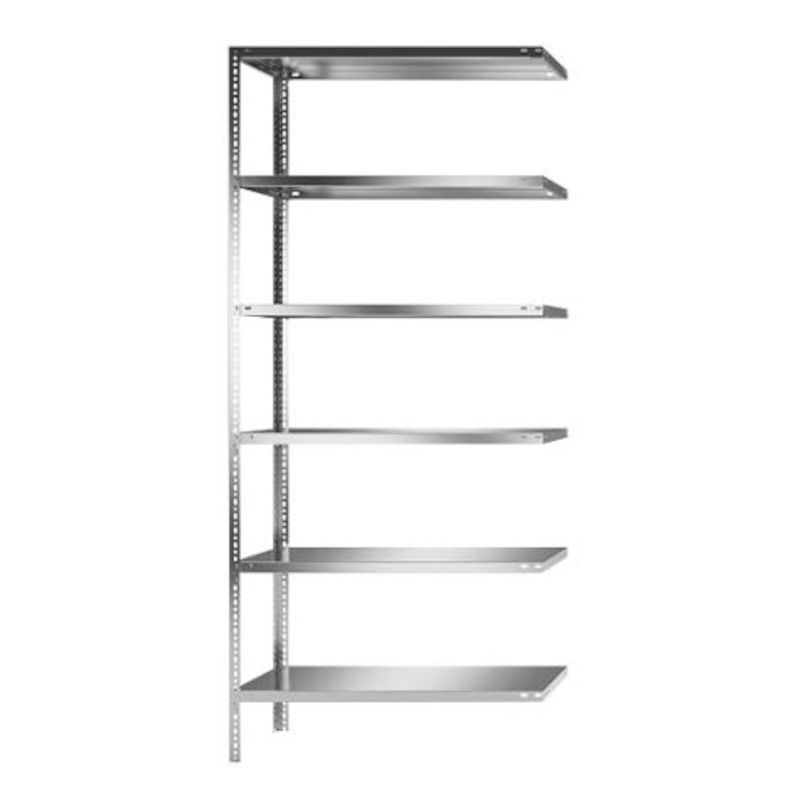 Lagerhylla Purmo, utbyggnad, BxDxH 1100x600x2500, 6 hyllplan rostfri. Av material 4301 som är motståndskraftig mot värme, kyla, väta och många kemikalier. Lätt att rengöra och desinfektera med alcohol eller liknande men även med högtryck och ångtvätt. Idealisk för storkök, restauranger, sjukhus, laboratorier och kylrum där höga krav ställs på rengöring eller material. Hyllan är livsmedelsgodkänd och funkar i alla typer av miljöer där livsmedelshantering finns. System med skruvhyllor. Stor lagerkapacitet tack vare stora hyllytor, kompakta skarvar mellan bas- och utbyggnader och hyllförflyttning i höjdled i små 25 mm-steg. Monteras med skruvar utan krysstag. Hyllorna stabiliseras med hörnplattor och kopplingsbleck. Fri åtkomst från båda sidor av Lagerhylla Purmo, inga krysstag som är i vägen. Ej avsedd för användning i miljöer med aggressiva ångor. Max utbredd belastning 200 kg/hyllplan. Extra hyllplan går att köpa till, dock får ej sektionsbelastningen överskridas som är 1200 kg/sektion.