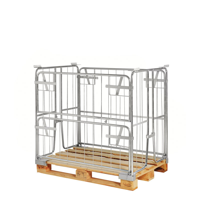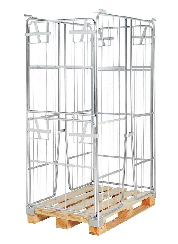 Pallram med galler Vikan, LxBxH 1200x800x1000 mm. Lasta ditt gods lätt och säkert med våra pallcontainers. En pallram anpassad för EUR-pall med staplingshörn. Halva långsidan går att fälla eller ta bort helt om man så önskar.