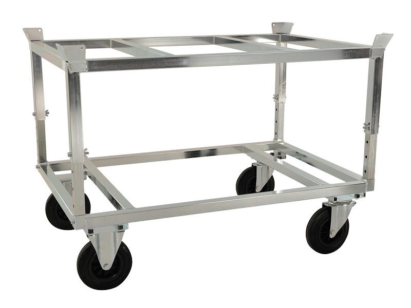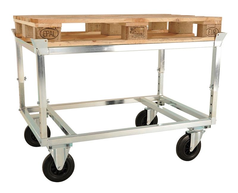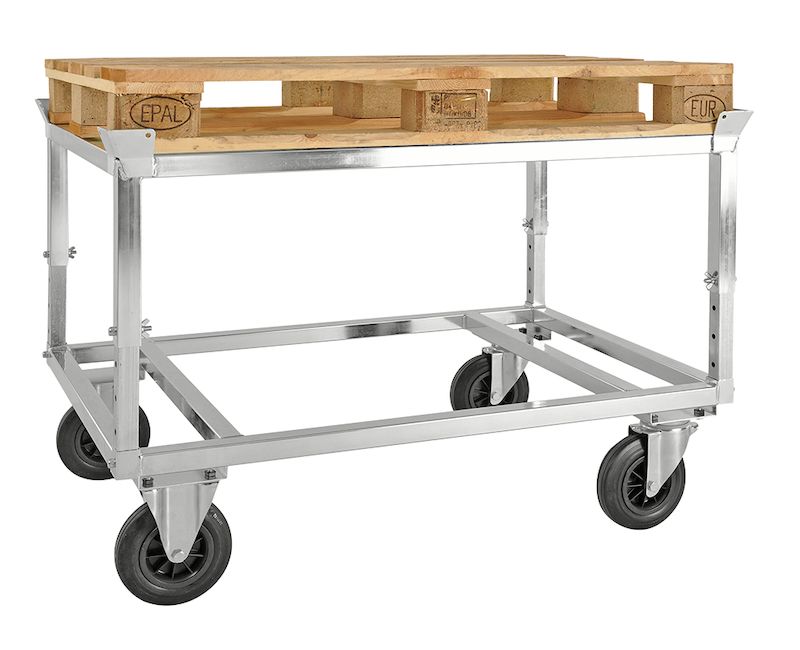 Pallvagn Helsvetsad, EUR LxB 1200x800 mm, H 655-835 mm, elförzinkad. Svensktillverkad helsvetsad pallvagn i bra kvalité. Fyra lättrullade kvalitétshjul. Anpassad för EUR-pallar med måtten 1200x800mm. Finns i helsvetsat och elförzinkat utförande samt i två fasta höjder och en variant som är inställbar i höjdled.