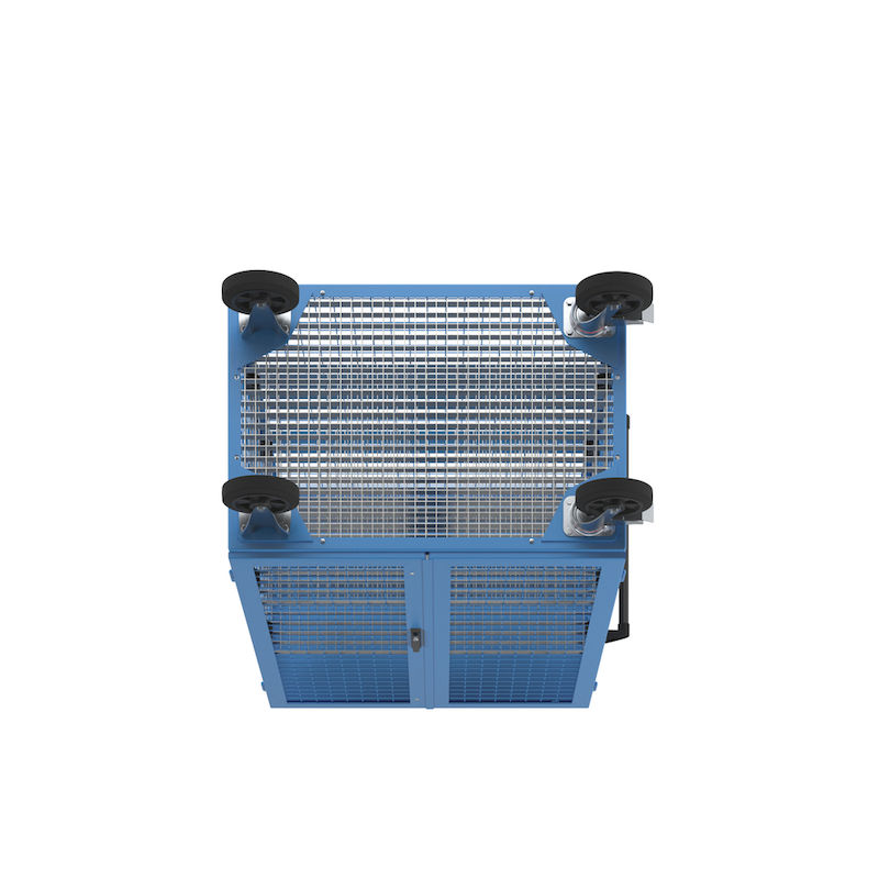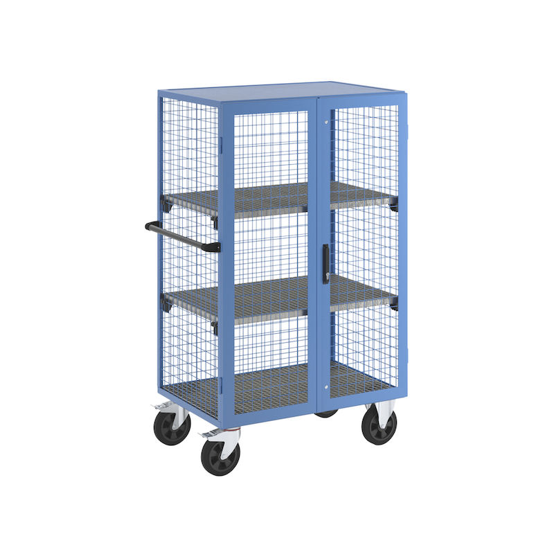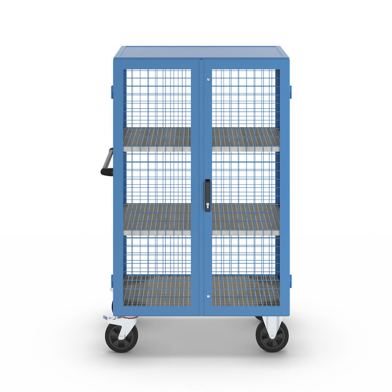 Med två dörrar och ett cylinderlås med huvudnyckel erbjuder skåpet en trygg förvaring. Nätgallret ger naturlig ventilation. De identiska låsen gör det enkelt att kombinera flera skåp och vagnar i ett system. Olika låsalternativ kan tillhandahållas på begäran. Skåpvagnen för gasflaskor har två länkhjul med dubbelbroms och två fasta hjul för flexibel användning av transportvagnen i verksamheten. Passande gallerhyllplan finns som tillbehör.