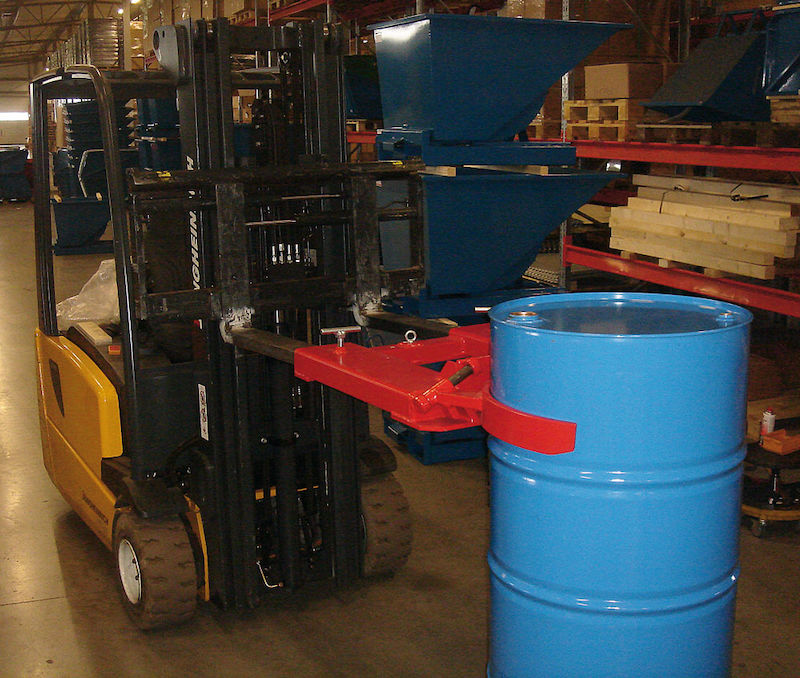 Mekanisk Fatgrip till gaffeltruck, max 300 kg. Fatgriparen lyfter och griper ett 200-liters stålfat enkelt och snabbt, utan hydrauliska eller elektriska anslutningar. När fatet lyfts låses det automatiskt av aggregatets armar.