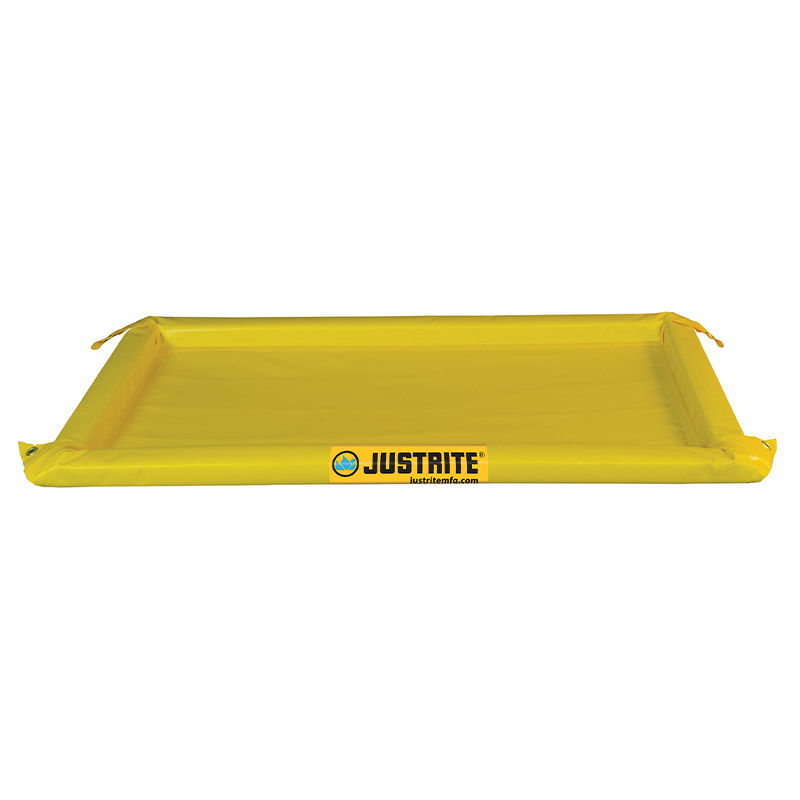 Spillbassäng uppfällbar Justrite, LxBxH 5652x3152x51 mm, 833 L, omonterad. Uppfällbar spillbassäng för tillfällig förvaring av behållare, batterier, smutsiga maskindelar och andra detaljer under underhåll.