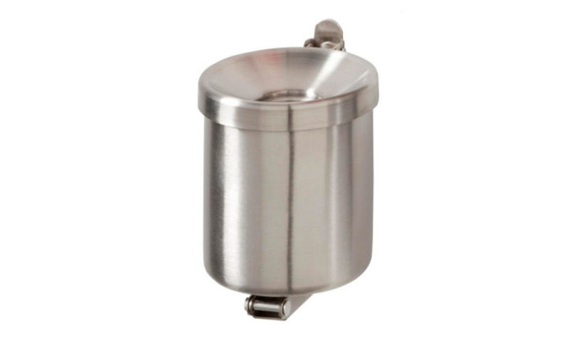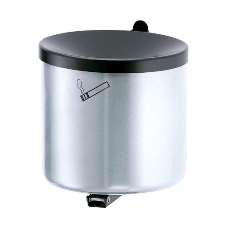 Vägghängd askkopp i rostfritt stål. Askkoppen har ett trattformat lock som gör att aska och fimpar enkelt glider ner i behållaren.