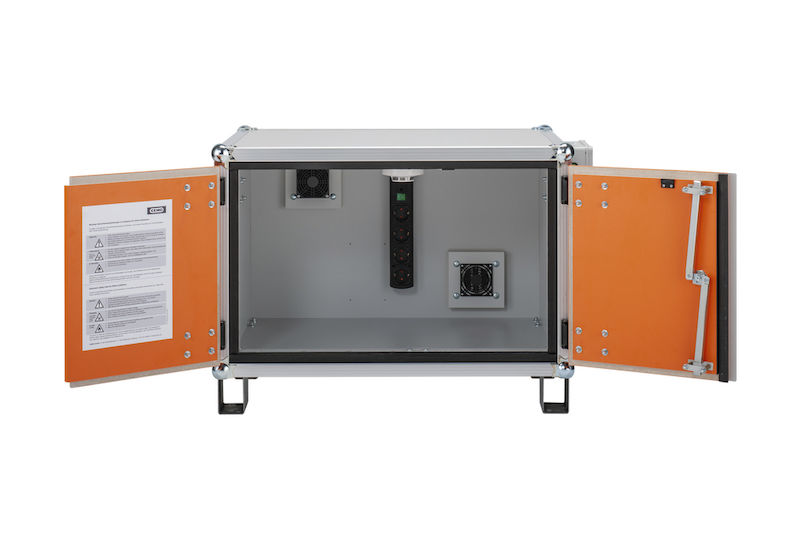 Batteriskåp Harald, med fötter, höjd 620 mm, 230 V, orange/grå. De flesta brandincidenter kopplade till litiumbatterier inträffar under laddning.