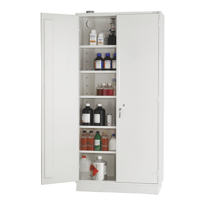 Kemikalieskåp Alexander, BxDxH 1000x450x2095 mm, vit med kodlås. Brandisolerade och låsbara kemikalieskåp som uppfyller Arbetsmiljöverkets krav på säker förvaring av kemikalier och farliga ämnen. Skåpet är brandisolerat med en isolering enligt ISO 1182 mellan dubbla plåtar, vilket gör att skåpet är testat mot yttre brand enligt metod 2369 av SP. Skåpet har också god ventilation, med en ventilationskanal som löper längs bakre vänstra hörnet och ställbara ventiler i över- och underkant. För att förhindra spill och avrinning är hyllplanen utformade med uppvikta kanter och slutna hörn.