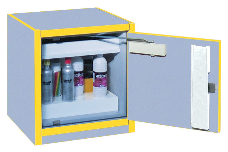 Kemikalieskåpet är utrustat med självstängande dörr. Dörren är uppställningsbar, men stängs automatiskt vid en temperaturstegring på 50°C i rummet.