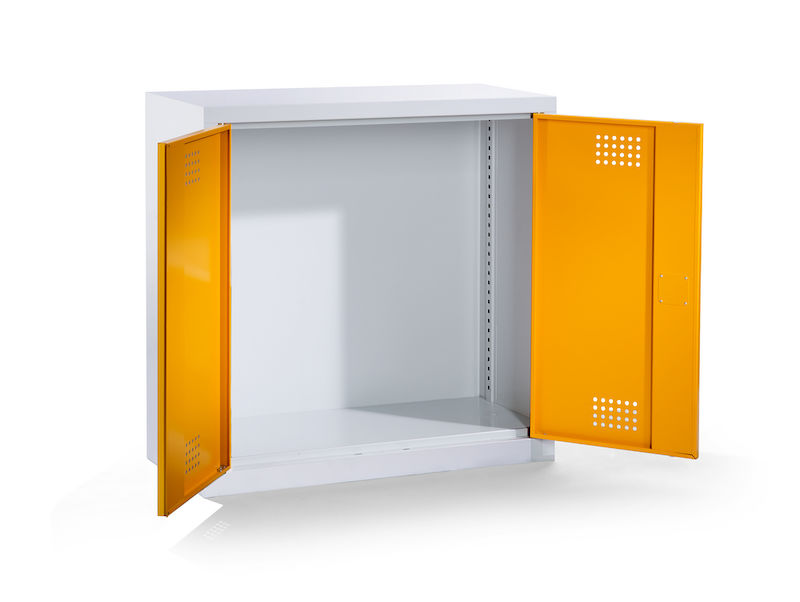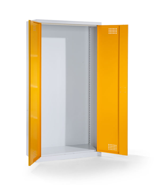 Miljöskåp Jim. Miljöskåpet eurokraft basic övertygar med sin funktionalitet, tålighet och prisvärdhet. Det passar för säker lagring inomhus av vätskor i små behållare. Den robusta konstruktionen i stålplåt ger stabil kvalitet och tillförliltighet. Metallskåpet är pulverlackerat, stommen i ljusgrått och dörrarna i melongult. Låsbara dörrar utrustade med ett cylinderlås säkrar skåpet mot obehörig åtkomst. Täckta låsstänger skyddar mot smuts och minskar olycksrisken, eftersom det kontakt. Perforerade dörrar säkerställer god ventilation i miljöskåpet.