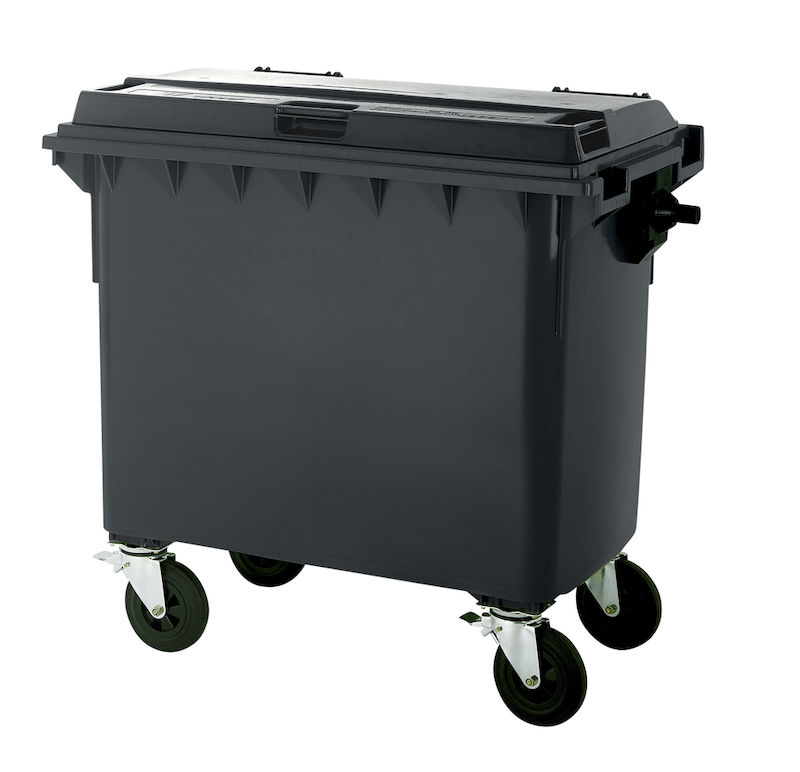 Sopkärl på hjul Vilma, volym 660 l, BxHxD 1360 x 1235 x 765 mm, antracitgrå. Plastsoptunnan på hjul enligt DIN EN 840 är en slitstark och praktisk lösning för professionell avfallshantering inom kommersiella verksamheter. Den robusta konstruktionen i högmolekylär polyeten (HDPE), tillverkad med avancerad formsprutningsteknik, ger lång livslängd och säker användning över tid.