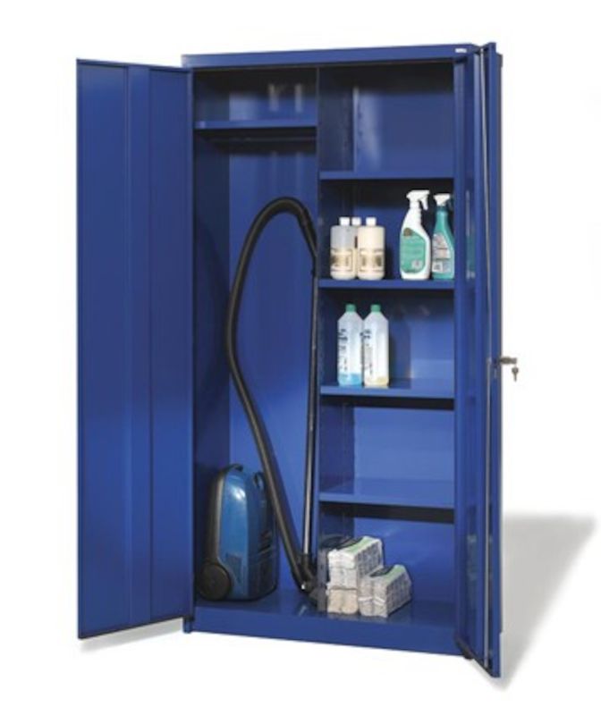 Keep städskåp, 5 hyllor och klädstång, blå. Ett mycket rejält helsvetsat skåp. Spanjolettlås med 2 nycklar. Pulverlackerat. Belastning 60 kg/hyllplan.