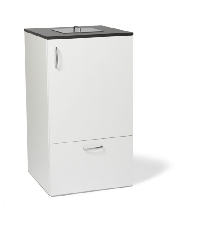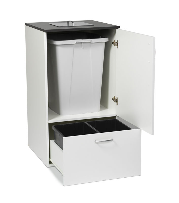 Källsorteringskåp Syrsa, toppinkast, 5 st källsorteringskärl 21 L , avfallstunna 90 L. Lättplacerat källsorteringsskåp för kök, kontor, kopieringsrum eller korridor. Tillverkade av tåligt laminat med vit stomme och mörkgrå toppskiva. BxDxH 600x600x1070 mm. Kvadratiskt toppinkast. Lämplig när det finns behov för sortering av många olika sorters avfall. Lock går att köpa som tillbehör. 2 st plastback 21 L och avfallstunna 90 L ingår i köpet.