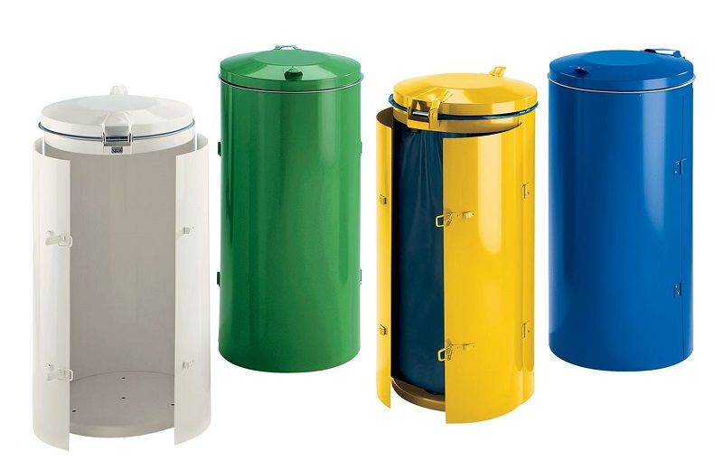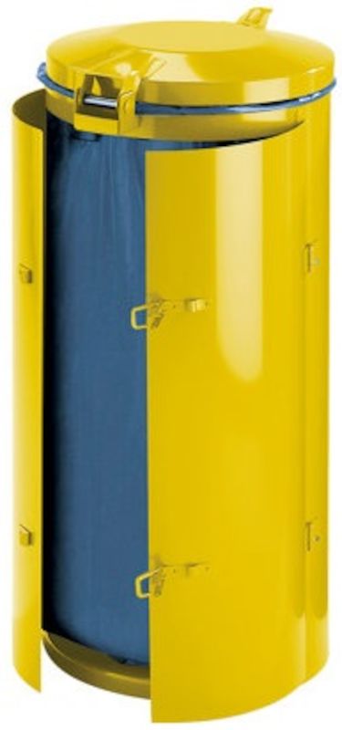 Avfallsbehållare i plåt Ruda, dubbeldörr, gul med metallock, 120 l. För inomhus och utomhusbruk. Robust utförande av galvad stålplåt, som är pulverlackerad i flera olika färger. Med klämring för 120-liters plastsäck och papperssäck. Botten med hål för säker fastsättning, så den inte kan stulen eller liknande. Enkelt att byta sopsäck vilket uppskattas av städarna.