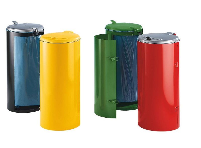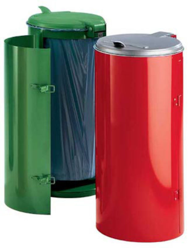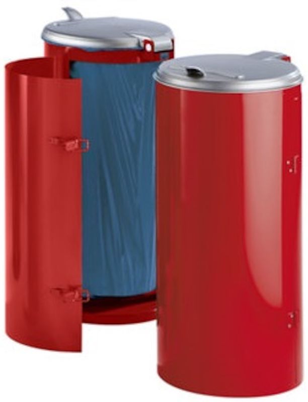 Avfallsbehållare i plåt Ruda, en dörr, röd med silver plastlock, 120 l. För inomhus och utomhusbruk. Robust utförande av galvad stålplåt, som är pulverlackerad i flera olika färger. Med klämring för 120-liters plastsäck och papperssäck. Botten med hål för säker fastsättning, så den inte kan stulen eller liknande. Enkelt att byta sopsäck vilket uppskattas av städarna.
