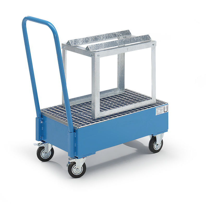 Fatpallsvagn Mona, LxB 800 x 500 mm, 1 x 60-literfat, liggande, blå RAL 5012. Godkänt uppsamlingskärl av 3 mm stålplåt med skjutbygel. 2 länkhjul och 2 fasta hjul, Ø 125 mm. Ett länkhjul med broms.