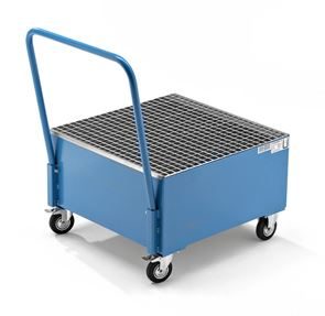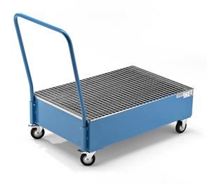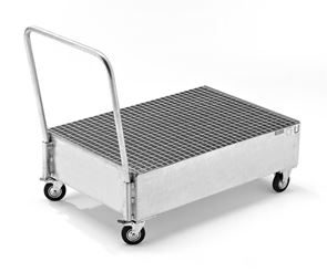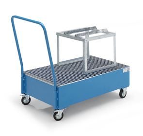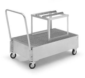 Fatpallsvagn Mona, LxB 800 x 500 mm, 2 x 60-litersfat, stående, varmförzinkat. Godkänt uppsamlingskärl av 3 mm stålplåt med skjutbygel. 2 länkhjul och 2 fasta hjul, Ø 125 mm. Ett länkhjul med broms.