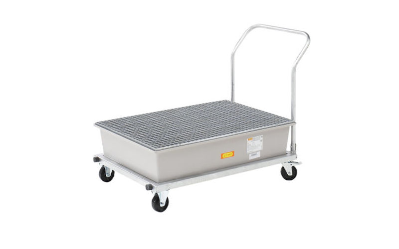 Fatvagn med skyddsbassäng, med gallerdurk, LxBxH 1520x860x1080 mm. Mycket beständig mot oljor, kemikalier (syror och alkalier), emulsioner och rengöringsmedel upp till pH-värde 8. För säker och föreskriven förvaring av vattenskadliga vätskor i GHS-kategori 1-4 även godkänd för brännbara vätskor (flampunkt 55 °C). Med allmänt godkännande Z-40.12-227 från DIBt-Berlin. Skyddsbassäng med uttagbar, varmgalvaniserad gallerdurk och varmgalvaniserat transportställ med påkörningsskydd. 2 länkhjul och fasta hjul med skjutbygel. För småfat, 60- och 200-litersfat.