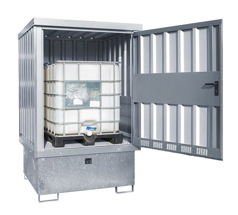 Miljöskåp, för 1 x 1000-l-IBC, galvaniserad. För förvaring av brännbara vätskor i GHS-kategori 1 – 3 utomhus och vattenskadliga vätskor i GHS-kategori 1 – 4 inom- och utomhus.