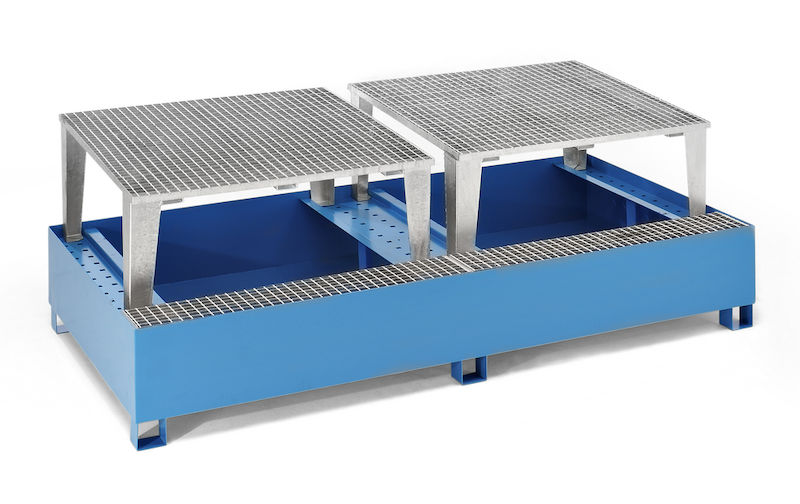 Uppsamlingskärl Rufus, för 2 x 1000 l-containertankar, 2 tappningsenheter, pulverlackerad, blå RAL 5012. Våra uppsamlingskärl av stål för IBC/KTC-containrar är en perfekt lösning för säker lagring och påfyllning av brännbara och vattenskadande vätskor. Trågen är tillverkade av helsvetsad 3 mm stålplåt och uppfyller de högsta kraven för säkerhet och hållbarhet. De är certifierade med en överensstämmelsförklaring (ÜHP) enligt StawaR och godkända för brännbara vätskor i GHS-kategori 1–3 och vattenskadande vätskor i GHS-kategori 1–4.