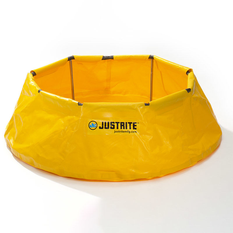 Spilltråg uppfällbar Justrite, Ø 1295 mm, volym 250 liter. Uppfällbart spilltråg för läckage under fordon, trummor, rör, ledningar och maskiner, för både inomhus och utomhusbruk.