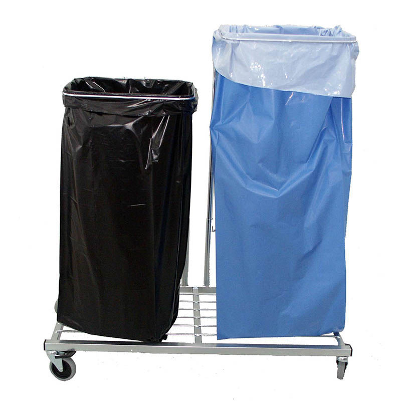 Sopsäckshållare dubbel, BxDxH 1150x540x890-1130 mm, 125-240 liter. Säcken fäster med klämring för största säkerhet, så sopsäcken inte trillar ur när den är fylld. Passar 125-240 liters säckar genom höjdjustering på säckhållaren. Vagnarna med 100 mm bromsade gummihjul. Lock köpes som tillbehör.