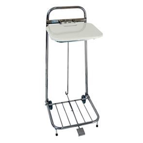 Sopsäckshållare på hjul med lock, fotpedal, 2 hjul, 60 liter, vit. Finns med rött eller vitt lock. Sopsäckshållaren med rött lock har fotpedalsmanövrerat lock. Finns i två olika storlekar, 60 eller 125 liter. Med 2 eller 4 hjul.