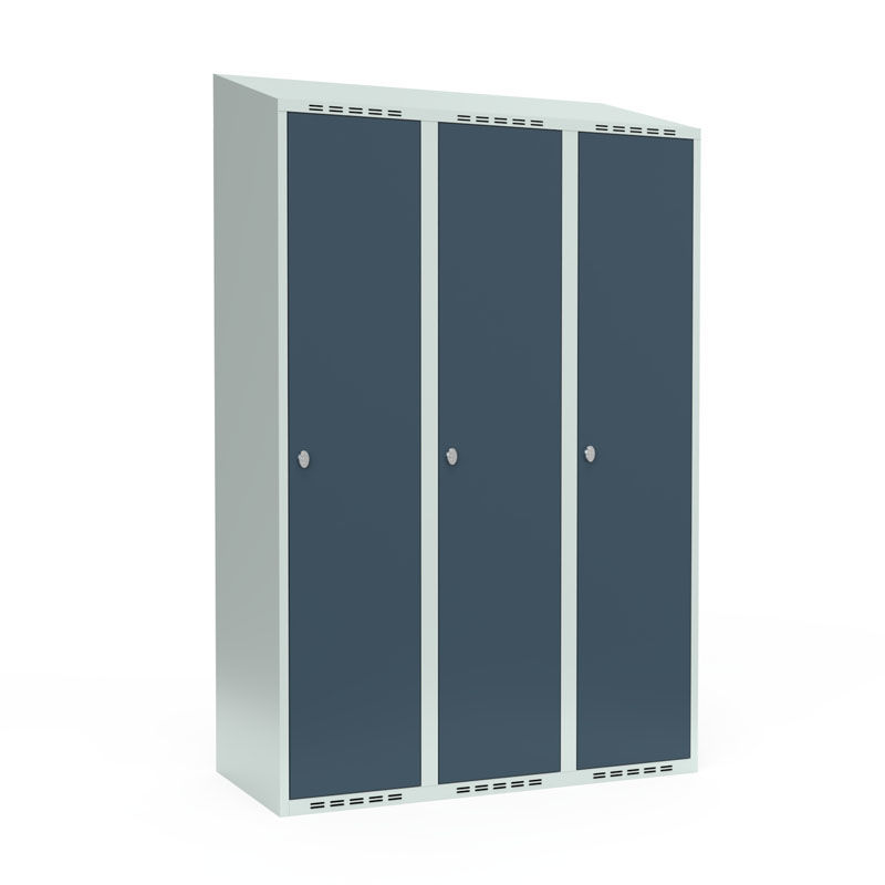 Klädskåp Fydor SMG, 1200 x550x1900 mm, 3 dörrar i 3 skåp, sluttande tak, grå/ljusgrå. Med Fydor-serien får du ett klassiskt men modernt helsvetsat omklädningsskåp med hög kvalitet och säkerhet.