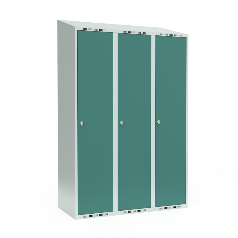 Klädskåp Fydor SMG, 1200 x550x1900 mm, 3 dörrar i 3 skåp, sluttande tak,grön/ljusgrå. Med Fydor-serien får du ett klassiskt men modernt helsvetsat omklädningsskåp med hög kvalitet och säkerhet.
