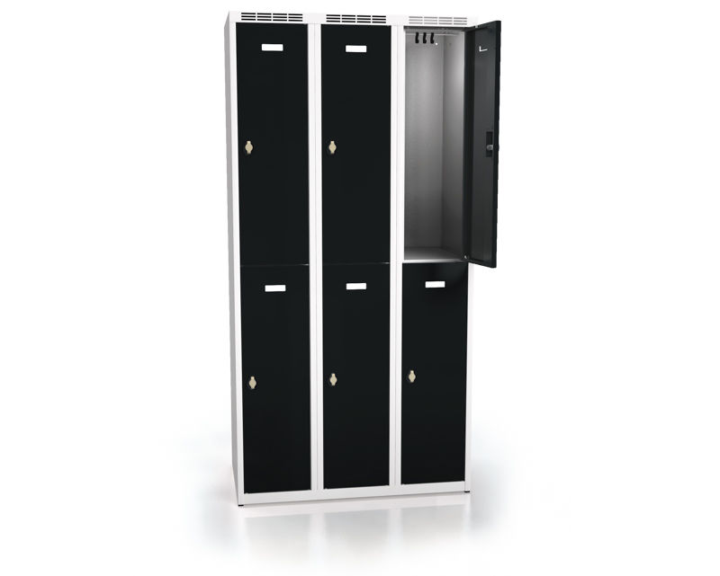 Klädskåp Hove, B 300/dörr, 6 dörrar i 3 skåp, grå/svart. Klädskåp för omgående leverans, färdiga att sättas på plats. Levereras monterat och med en 40 mm integrerad sockel. Skåp med hel dörr levereras med hatthylla, klädstång och krokar.