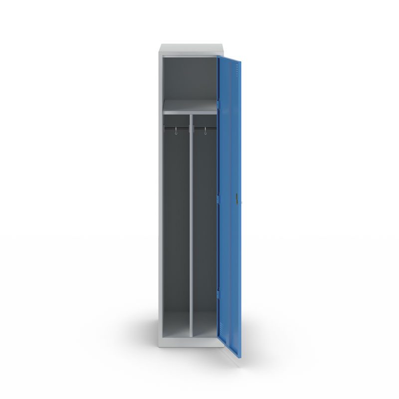 Stålskåpet Alvina har en praktisk hatthylla med två klädstänger inklusive krokar och är dessutom utrustat med en skiljevägg så att du kan hålla arbets- och privatkläder åtskiljda. Perforeringen i dörren sörjer för optimal ventilation av kläderna.