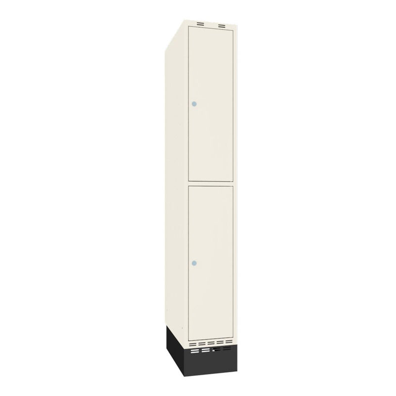 Helskåp kommer med hatthylla och klädstång inklusive ankarkrokar, och 2-delat skåp med klädstång inklusive ankarkrokar som standard, skåp med tre, fyra och fem fack i höjd är utan inredning. 18 mm tjocka dörrar av specialprofilerad och pulverlackerad stålplåt, infällda i karmen med dolda gångjärn. Dörrstopp vid 90 grader samt invändig förstärkningsplåt runt låshålet. Slät skåpbotten utan trösklar som underlättar städning. Sockel som standard lackerad i svart färg.