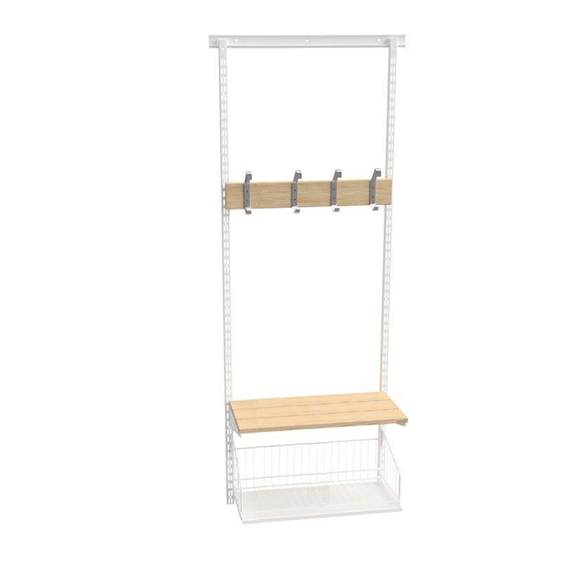 Klädfack Savalen, vägghängd, B 600 mm, vit, modell B, grund. Praktiskt och smidigt klädfack med flera olika utrustningsalternativ. Finns både som golvställ och väggställ. Bygg din egen lösning med grundsektioner och utbyggnadssektioner. Utrustningen är flyttbar i steg om 25 mm. Golvställen är utrustade med ställfötter för ojämnt underlag. Modell A: Skohylla med dropplåt, sittbänk, kroklist och hatthylla i trådutförande. Modell B: Skohylla med dropplåt i trådutförande, sittbänk och kroklist i björk. Modell C: Skohylla med dropplåt och klädfack i perforerad plåt, sittbänk och kroklist i björk. Modell D: Vinklingsbar skohylla och kapprumshylla i perforerad plåt, sittbänk i björk.