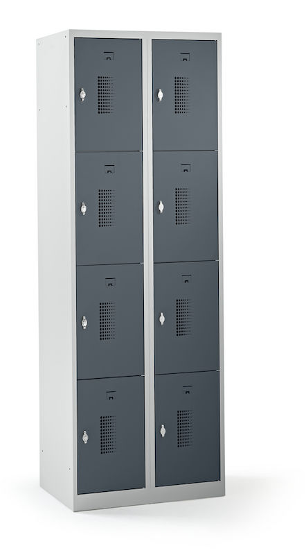 Småfacksskåp med 4 fack Amsterdam, 2 sektioner, ljusgrå/basaltgrå, B 600 mm, 8 fack, vridregel. Vårt prisvärda småfacksskåp övertygar när det gäller funktionalitet, lång livslängd och mångsidig användning. Skåpstommen är ljusgrå och lätt att rengöra. Pulverlackerat stål med 0,70 mm materialtjocklek säkerställer nödvändig säkerhet vid förvaring av personliga värdesaker. Variera antalet fack, låstyp, dörrfärg och klädskåpsbredd utifrån behov och platstillgång. Perforering i dörrarna säkerställer optimal luftcirkulation.