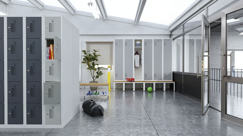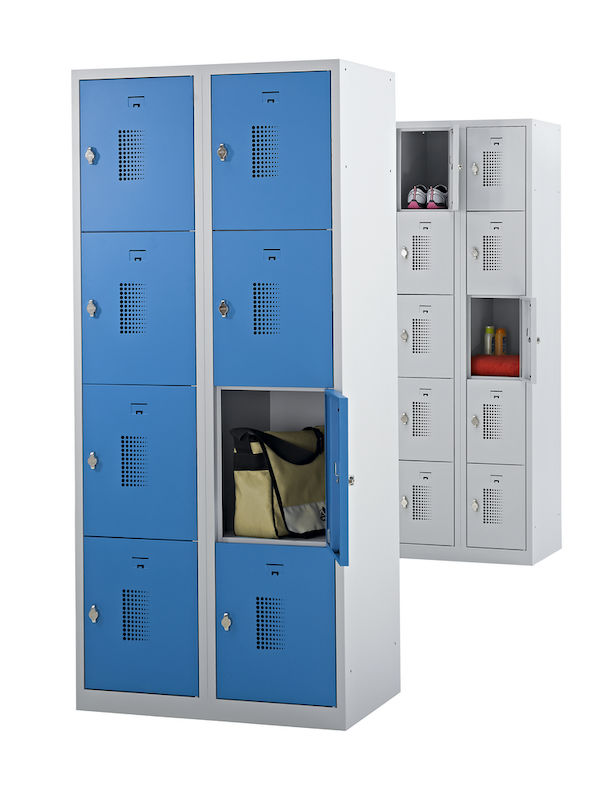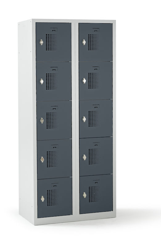 Småfacksskåp med 5 fack Amsterdam, 2 sektioner, ljusgrå/basaltgrå, B 800 mm, 10 fack, vridregel. Vårt prisvärda småfacksskåp övertygar när det gäller funktionalitet, lång livslängd och mångsidig användning. Skåpstommen är ljusgrå och lätt att rengöra. Pulverlackerat stål med 0,70 mm materialtjocklek säkerställer nödvändig säkerhet vid förvaring av personliga värdesaker. Variera antalet fack, låstyp, dörrfärg och klädskåpsbredd utifrån behov och platstillgång. Perforering i dörrarna säkerställer optimal luftcirkulation. På varje dörr finns det dessutom en etiketthållare med måtten 30 x 50 mm för enkel namnanpassning.