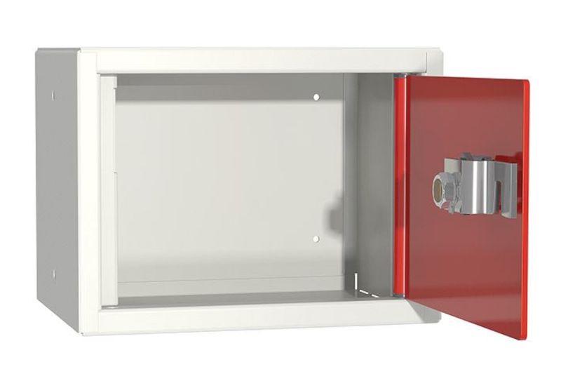 Värdefackskåp Sonesson Mini, BxDxH 200x150x150 mm, röd/vit. Värdefackskåp med cylinderlås. Huvudnyckelsystem finns som tillbehör.