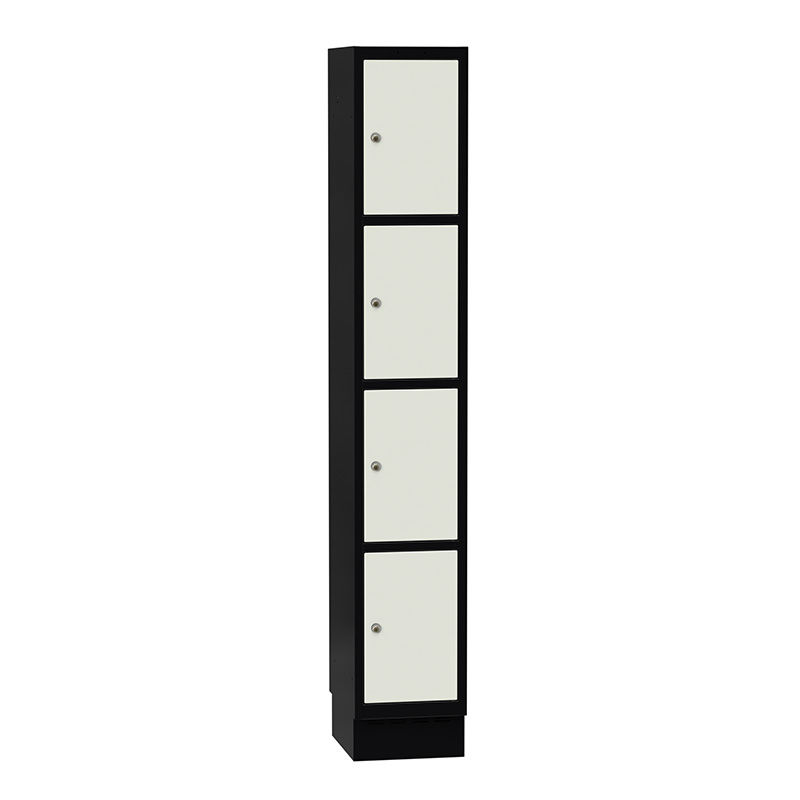 Elevskåp Sonesson Flex, 4 dörrar i 1 skåp, BxDxH 300x400x1900 mm, vit/svart. Ett elevskåp som finns i flera olika färger och material att välja mellan. Tillverkad i plåt, lackerad som standard i varmvit eller svart färg. Fördelen med Flex-serien är att du kan till exempel ha ett helt klädskåp ihop med elevskåp och samtidigt behålla samma utseende på skåpen, då dom ingår i samma serie. Sockel som standard lackerad i svart färg. Levereras som standard med ASSA-lås 8450 och 2 nycklar. För annat låsalternativ än standard - kontakta kundtjänst för att beställa: 0433-740 80.