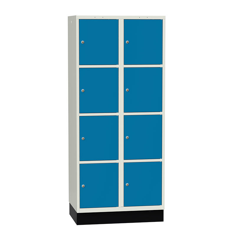 Elevskåp Sonesson Flex, 8 dörrar i 2 skåp, BxDxH 800x550x1900 mm, blå/vit. Ett elevskåp som finns i flera olika färger och material att välja mellan. Tillverkad i plåt, lackerad som standard i varmvit eller svart färg. Fördelen med Flex-serien är att du kan till exempel ha ett helt klädskåp ihop med elevskåp och samtidigt behålla samma utseende på skåpen, då dom ingår i samma serie. Sockel som standard lackerad i svart färg. Levereras som standard med ASSA-lås 8450 och 2 nycklar. För annat låsalternativ än standard - kontakta kundtjänst för att beställa: 0433-740 80.