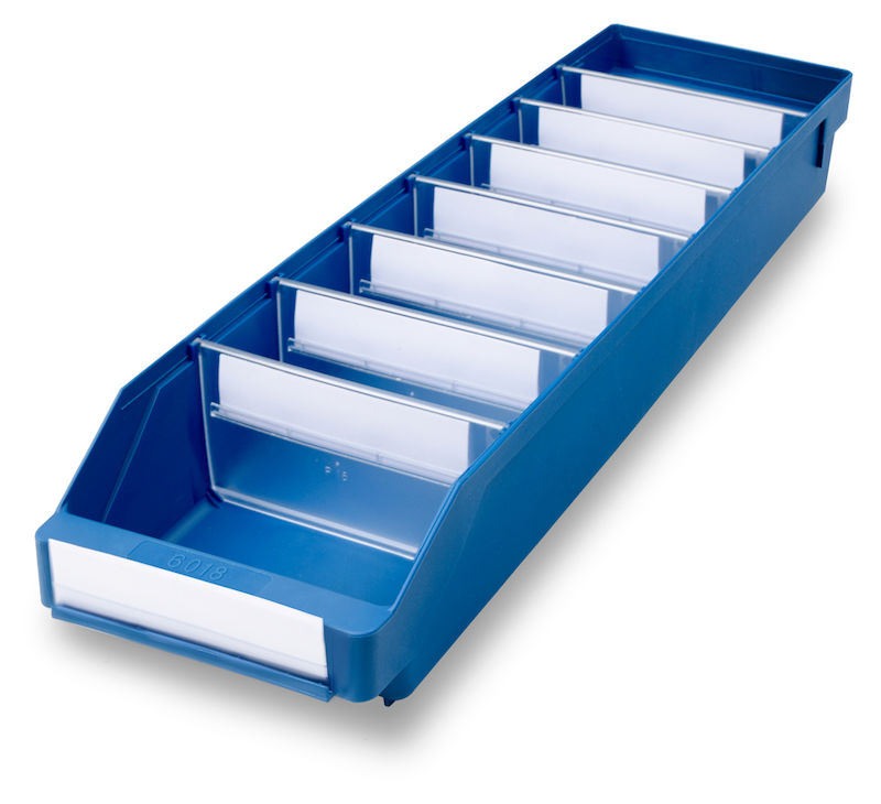 Lagerlåda Stemo 600x180x95 mm, 20-pack, blå. Smarta hyllanpassade lagerlådor för olika hylldjup som passar alla typer av hyllställ. Lagerlådan är miljöanpassad, tillverkad i miljövänlig polypropen och återvinningsbar.
