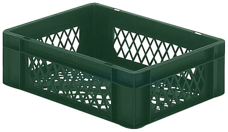 Plastback Teff med perforerad sida och botten, LxBxH 400x300x120 mm, grön, 5-pack. För så gott som varje behov på lagret, i produktionen eller vid transport. Av högvärdig, livsmedelssäker polypropen (PP-plast) med hög stabilitet.