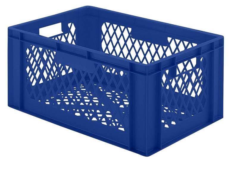 Plastback Teff med perforerad sida och botten, LxBxH 600x400x266 mm, blå, 5-pack. För så gott som varje behov på lagret, i produktionen eller vid transport. Av högvärdig, livsmedelssäker polypropen (PP-plast) med hög stabilitet.